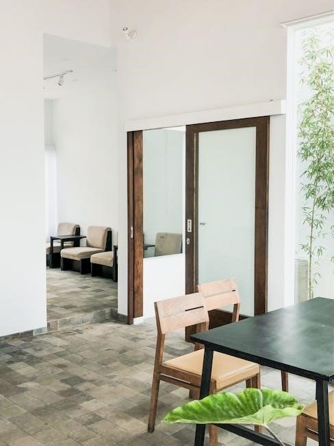Pre-drill a pilot hole if necessary, then secure the guide using a Phillips head screwdriver. Repeat this process for the other side, ensuring both guides are level and aligned. Gently test the door’s sliding motion; it should move smoothly within the track. Adjust if needed, confirming the spring-loaded tip engages correctly for stable operation.
